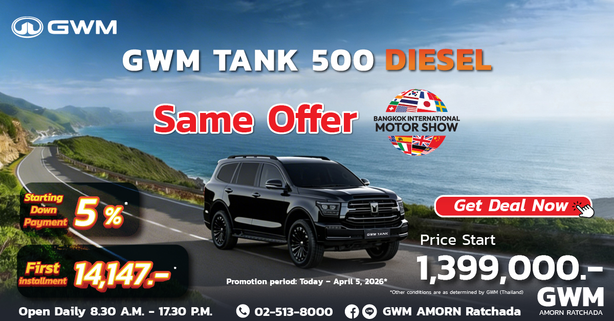 1. Special cash discount of up to 20,000 Baht, applicable for full cash payment and leasing, Interest rate for 2.15% for down payment 25% installment up to 48 months. The conditions as specified by the Bank and the participating financial institutions