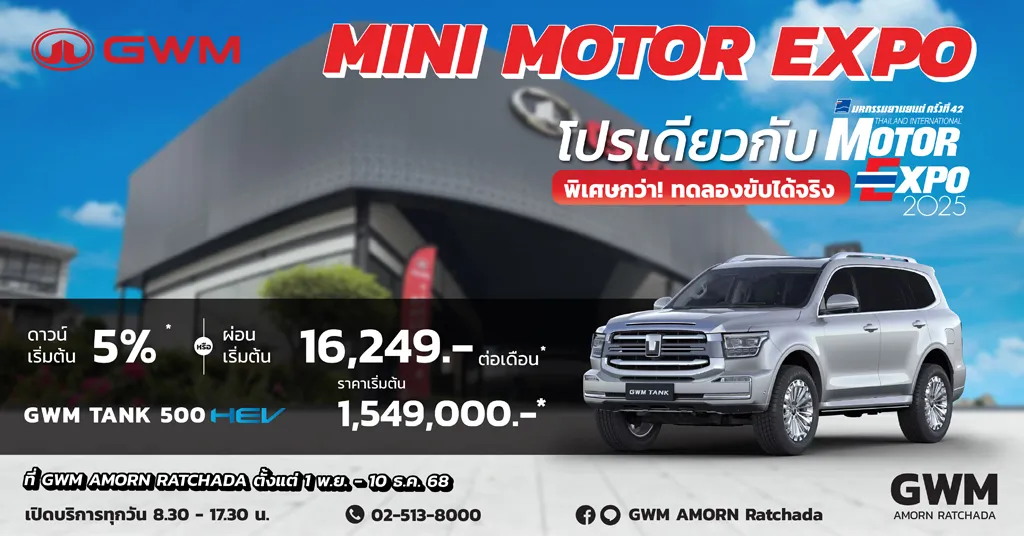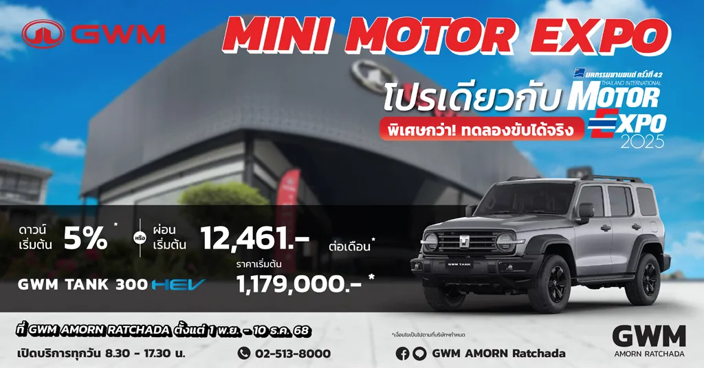 Special offer for October 2025: Purchase the ALL NEW GWM TANK 500 (2023 production year). Total value up to 680,000 baht for the ULTRA model and up to 560,000 baht for the PRO model.