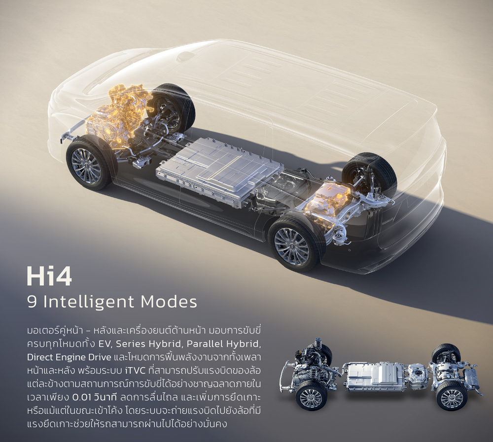 - ระบบขับเคลื่อน 4 ล้ออัจฉริยะ Hi4: ไม่ใช่แค่เรื่องความแรง แต่คือความปลอดภัย ระบบ Hi4 ผสานการทำงานของมอเตอร์คู่และเครื่องยนต์ พร้อมระบบ iTVC (Intelligent Torque Vectoring Control) ที่ปรับกระจายแรงบิดไปยังล้อทั้งสี่ภายใน 0.01 วินาที ช่วยลดการลื่นไถลและเพิ่มการยึดเกาะถนนสูงสุด ไม่ว่าจะเป็นถนนเปียก เข้าโค้ง หรือสถานการณ์ฉุกเฉิน คุณจึงควบคุมรถได้อย่างมั่นใจในทุกสภาพถนน