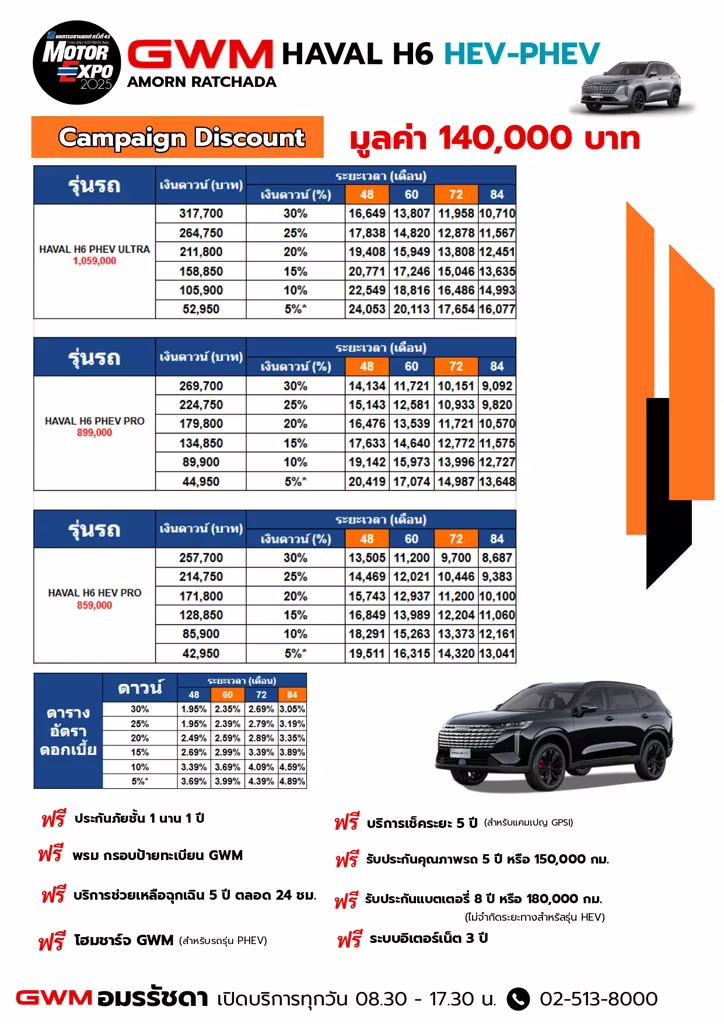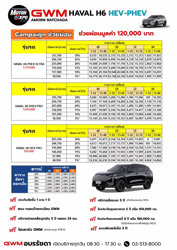ตารางผ่อนรุ่น Haval H6 HEV รถ SUV ไฮบริดขนาดใหญ่จากแบรนด์ Haval ซึ่งใช้เครื่องยนต์เบนซิน 1.5 ลิตร เทอร์โบ ทำงานร่วมกับมอเตอร์ไฟฟ้า ให้กำลังรวม 243 แรงม้า พร้อมแรงบิด 530 นิวตัน-เมตร