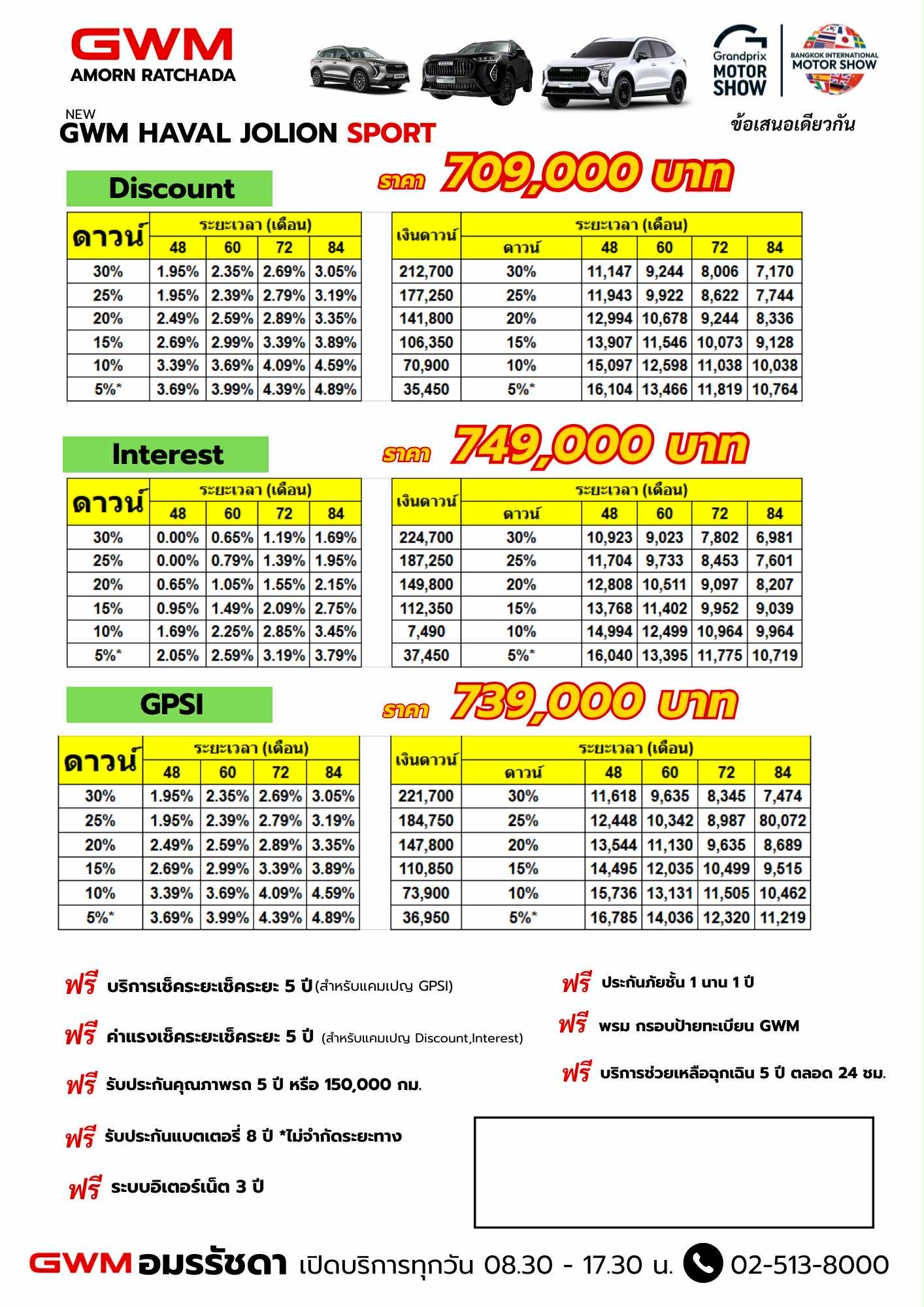 ที่สำคัญ GWM อมรรัชดายังมี โปรโมชั่นสุดพิเศษ ที่พร้อมมอบให้ ทั้งข้อเสนอด้านการเงินที่ยืดหยุ่น ของแถมจัดเต็ม และสิทธิประโยชน์ที่จะช่วยให้คุณได้เป็นเจ้าของรถได้ง่ายขึ้นกว่าที่คิด ไม่ว่าคุณจะกำลังมองหารถรุ่นใด ทีมงานพร้อมสรรหาดีลที่ตรงกับความต้องการของคุณมากที่สุด