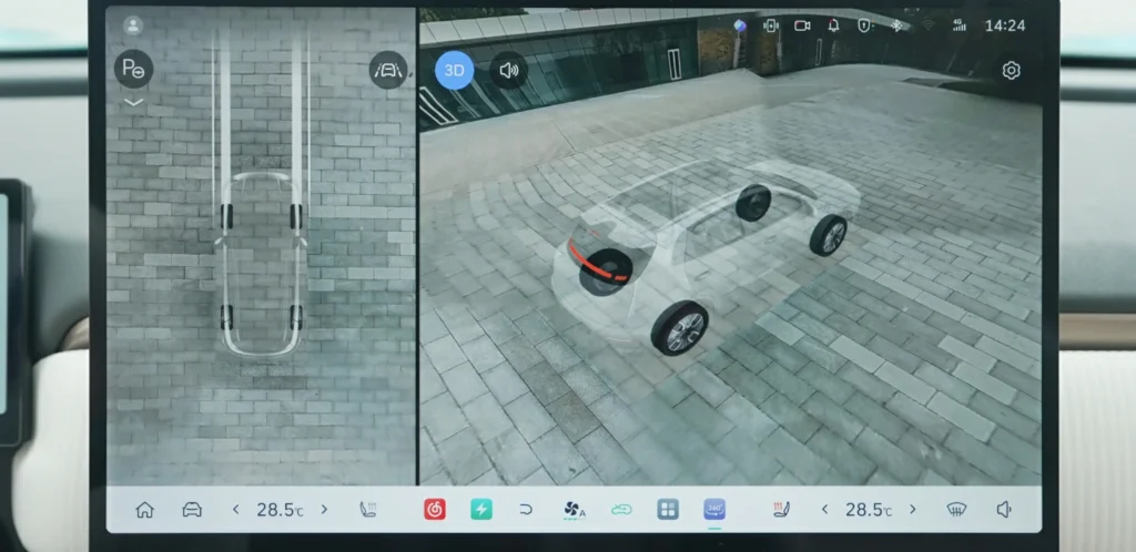 - ระบบภาพรอบทิศทาง 360° พร้อมโหมดโปร่งใส รถคันนี้สามารถแสดงภาพเคลื่อนไหวแบบพาโนรามาของบริเวณโดยรอบและพื้นผิวถนนด้านล่างได้
