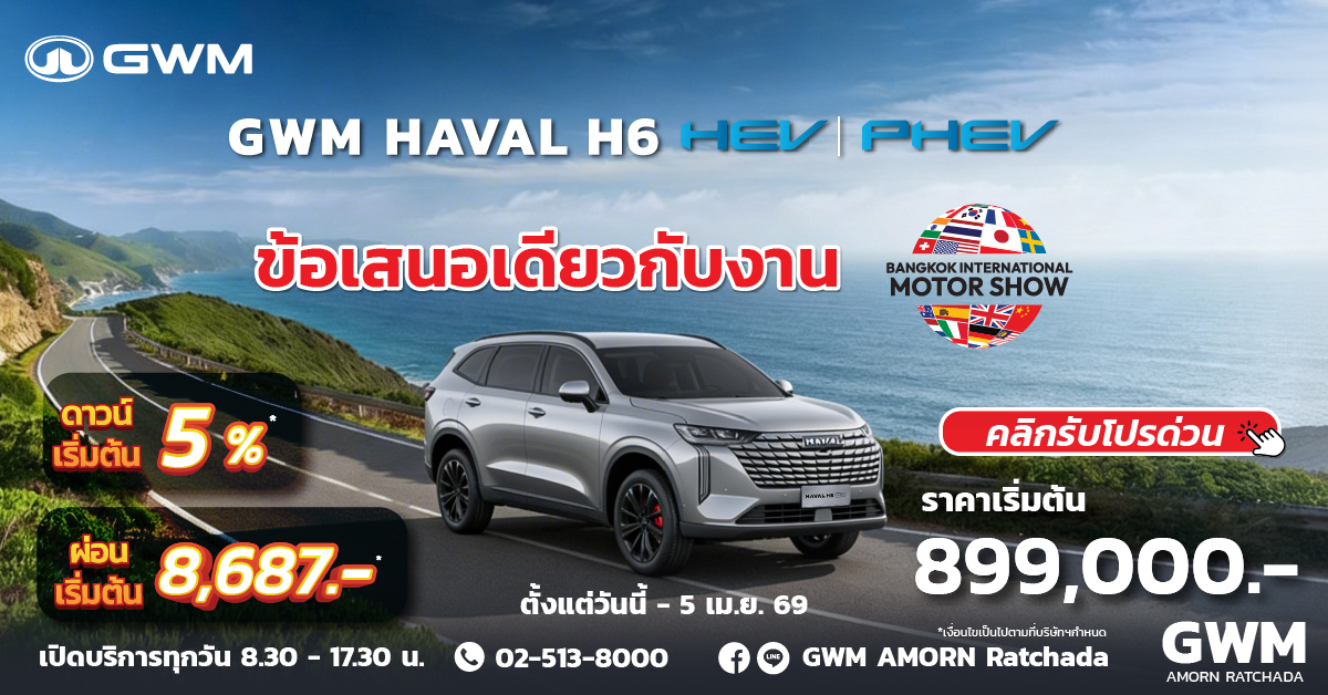 2) โปรแกรม GWM ช่วยผ่อนนาน 6 เดือน เดือนละ 10,000 บาท สำหรับรุ่น GWM HAVAL H6 Hybrid รุ่น PRO มูลค่าสูงสุดไม่เกิน 60,000 บาท โดยเป็นส่วนลดเงินผ่อนในอัตราที่ลูกค้าเลือก สำหรับการผ่อนชำระงวดที่ 1 จนถึง 6 จากนั้น งวดที่ 7 จะเป็นการผ่อนชำระตามสัญญาปกติ ทั้งนี้ เงื่อนไขเป็นไปตามที่ธนาคาร และสถาบันการเงินที่ร่วมรายการกำหนด