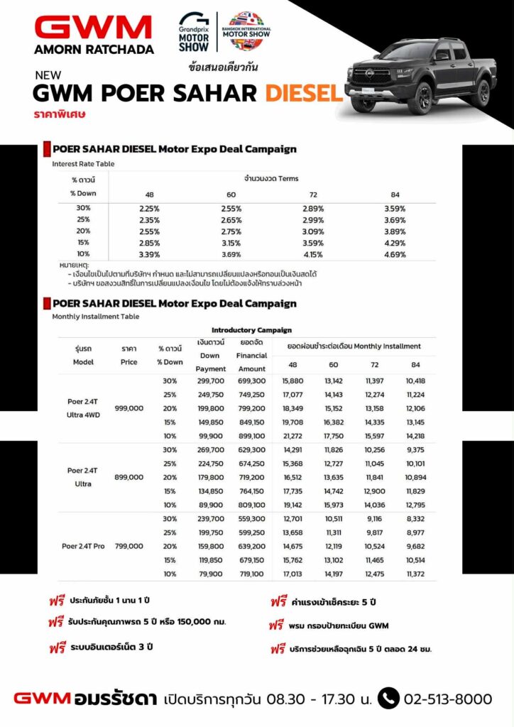 1. รับส่วนลดเงินสดมูลค่า 50,000 บาท* เมื่อชำระด้วยเงินสดหรือจัดไฟแนนซ์ ดอกเบี้ย 2.35%** ผ่อนนาน 48 เดือน เมื่อดาวน์ 25% ทั้งนี้ เงื่อนไขเป็นไปตามที่ธนาคาร และสถาบันการเงินที่ร่วมรายการกำหนด (ส่วนลดสำหรับผู้จองและรับรถยนต์สำเร็จจำนวน 300 คันแรกเท่านั้น เมื่อจองรถตั้งแต่วันที่ 29 พฤศจิกายน 2568 ถึงวันที่ 31 มีนาคม 2569 และรับรถภายในวันที่ 31 มีนาคม 2569 สิทธิมีจำนวนจำกัด GWM Partner Store สงวนสิทธิ์ในการแจ้งสิ้นสุดแคมเปญเมื่อยอดจองรถยนต์ครบจำนวน โดยลูกค้าสามารถสอบถามและตรวจสอบจำนวนรถและสิทธิของลูกค้าได้ที่ iAM ที่ให้บริการท่าน)