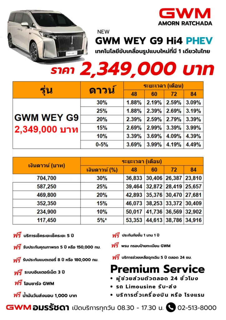 4. ฟรี GWM โฮมชาร์จเจอร์พร้อมติดตั้งในระยะสายไฟยาวไม่เกิน 15 เมตร 1 ครั้ง จากตู้ควบคุมไฟฟ้าในบ้าน (ตู้เมน) (ไม่รวมแท่นชาร์จ หากต้องการติดตั้งมีค่าใช้จ่ายเพิ่มเติมและผู้รับการติดตั้งต้องตรวจสอบและเตรียมมิเตอร์ไฟที่สามารถใช้กับโฮมชาร์จเจอร์ด้วยตนเอง) มูลค่าสูงสุดไม่เกิน 25,000 บาท ศึกษาข้อมูลการติดตั้งเพิ่มเติมที่ http://www.gwm.co.th/Charge.html