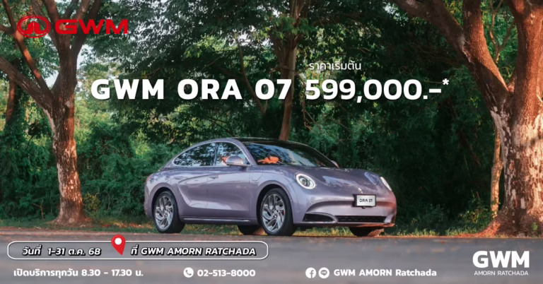 โปรโมชันนี้สามารถใช้ได้กับรถยนต์ไฟฟ้า GWM ORA 07 เท่านั้น ตั้งแต่วันที่ 1 ตุลาคม 2568 ถึง วันที่ 31 ตุลาคม 2568 และ กำหนดรับรถรับรถภายในวันที่ 31 ตุลาคม 2568เงื่อนไขเป็นไปตามที่บริษัทฯ กำหนด