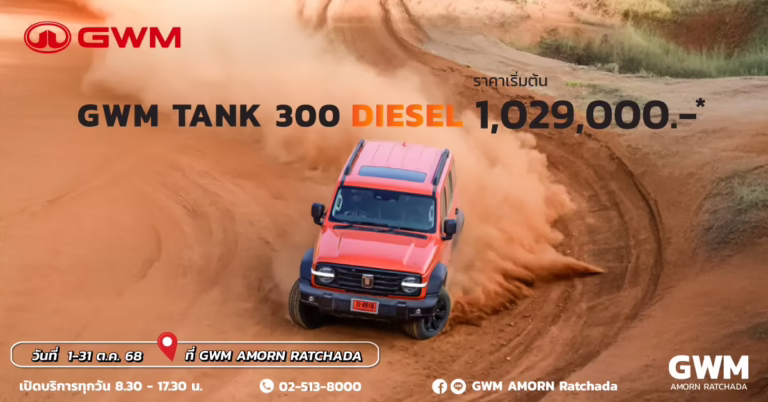 ข้อเสนอประจำเดือนตุลาคม 2568 เมื่อซื้อ NEW GWM TANK 300 DIESEL รวมมูลค่าสูงสุดกว่า 71,500 บาท สำหรับรุ่น 2.4T Pro และ 82,000 บาท สำหรับรุ่น 2.4T Ultra และ 2.4T Ultra 4WD