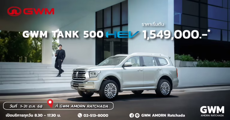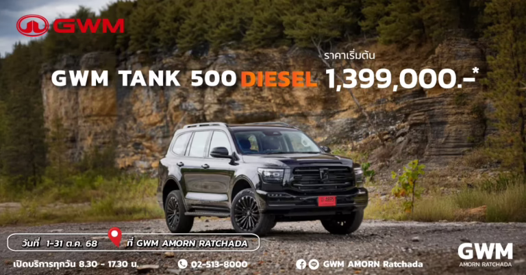 ข้อเสนอประจำเดือนตุลาคม 2568 เมื่อซื้อ NEW GWM TANK 500 DIESEL รวมมูลค่าสูงสุดกว่า 117,000 บาท สำหรับรุ่น 2.4T Ultra และ 2.4T Ultra 4WD และ 117,000 บาท สำหรับรุ่น 2.4T Pro