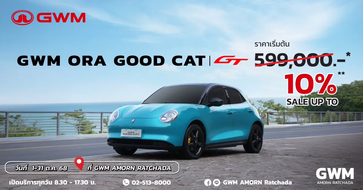 *ส่วนลดดังกล่าว สามารถใช้ได้เฉพาะสำหรับการจองรถยนต์ GWM New ORA Good Cat รุ่น GT คันใหม่ ระหว่างวันที่ 1 ตุลาคม 2568 ถึง วันที่ 31 ตุลาคม 2568 และรับรถภายในวันที่ 31 ตุลาคม 2568 เท่านั้น โดยเป็นส่วนลดจากราคาสุทธิของรถยนต์ ไม่สามารถนำมาเป็นส่วนลดเงินดาวน์ โอน หรือแลกเปลี่ยนเป็นเงินสดหรือสิทธิประโยชน์อื่นใดนอกเหนือจากที่บริษัทกำหนดได้