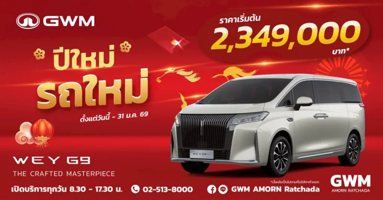 ข้อเสนอประจำเดือนมกราคม 2569 เมื่อซื้อ GWM WEY G9 HI4 รุ่น ULTRA รวมมูลค่าสูงสุดกว่า 146,000 บาท