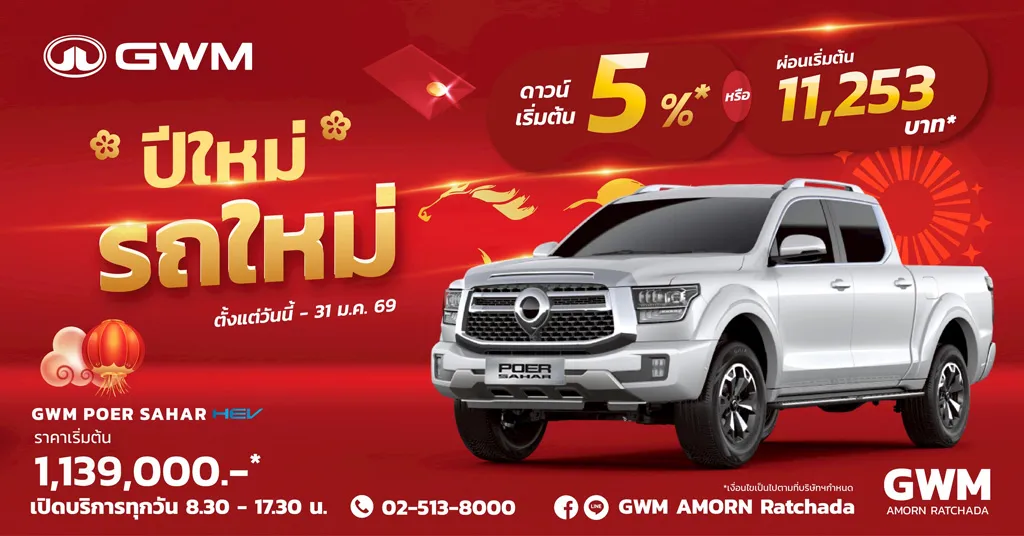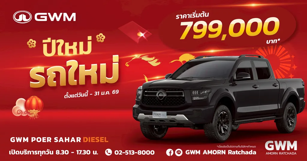 ข้อเสนอประจำเดือนพฤศจิกายน 2568 เพื่อซื้อ NEW GWM POER SAHAR SINGLE CAB รวมมูลค่าสูงสุดกว่า 4,000 บาท สำหรับรุ่น SINGLE CAB