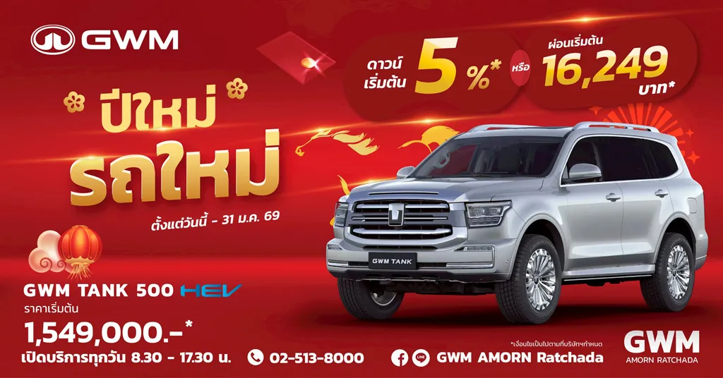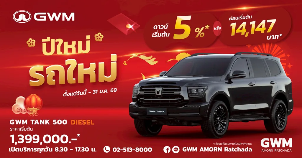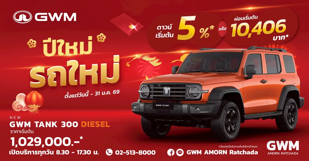 โปรโมชั่นนี้สามารถใช้ได้กับรถ ALL NEW GWM TANK 300 DIESEL เมื่อจองรถยนต์วันที่ 1 มกราคม 2569 ถึง วันที่ 31 มกราคม 2569 และรับรถภายในวันที่ 31 มกราคม 2569 ทั้งนี้ เงื่อนไขเป็นไปตามที่บริษัทฯ กำหนด