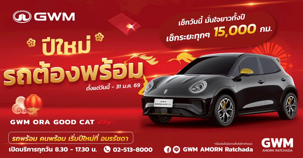 โปรโมชันนี้สามารถใช้ได้กับรถยนต์ไฟฟ้า GWM ORA 07 เท่านั้น เมื่อจองรถยนต์วันที่ 1 มกราคม 2569 ถึง วันที่ 31 มกราคม 2569 และรับรถภายในวันที่ 31 มกราคม 2569 ทั้งนี้ เงื่อนไขเป็นไปตามที่บริษัทฯ กำหนด