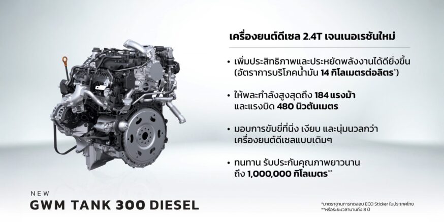 หัวใจสำคัญของ TANK 300 Diesel คือเครื่องยนต์ดีเซล 2.4T เจเนอเรชันใหม่ ที่ให้กำลังสูงสุดถึง 184 PS ที่ 3,600 รอบ/นาที และแรงบิดมหาศาลถึง 480 Nm ตั้งแต่รอบต่ำที่ 1,500 – 2,500 รอบ/นาที ช่วยให้การเร่งแซงในจังหวะการจราจรที่หนาแน่นทำได้อย่างทันใจ นอกจากนี้ยังมี 7 เทคโนโลยีลดเสียงและการสั่นของเครื่องยนต์ เพื่อมอบความเงียบสงบภายในห้องโดยสารตลอดการเดินทาง พร้อมการรับประกันมากถึง 1,000,000 กิโลเมตร ให้คุณใช้งานได้อย่างสบายใจ