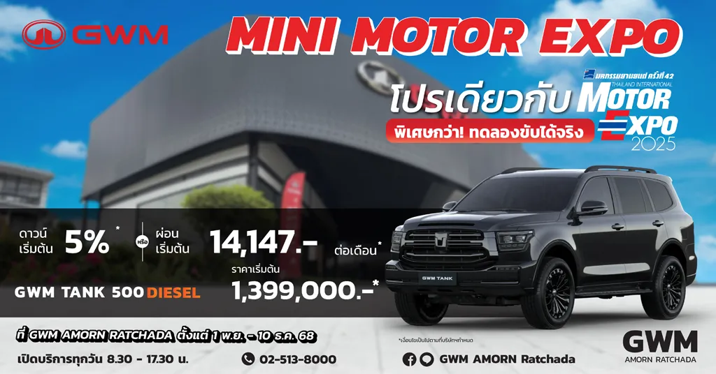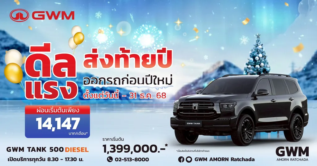 GWM ประเทศไทย เปิดเกมบุกตลาดรถอเนกประสงค์ขนาดกลางด้วย GWM TANK 500 DIESEL รุ่นใหม่ล่าสุด ที่มาพร้อมราคาพิเศษช่วงเปิดตัวเริ่มต้นเพียง 1,399,000 บาท สำหรับ 500 คันแรก โดยรถรุ่นนี้ผลิตในประเทศไทย วางตำแหน่งเป็น SUV ขนาดใหญ่ที่มาพร้อมขุมพลังดีเซล 2.4 ลิตร เทอร์โบ ระบบขับเคลื่อนทั้งแบบ 2 ล้อ และ 4 ล้อ พร้อมฟีเจอร์ความปลอดภัยและความสะดวกสบายระดับพรีเมียม ตั้งเป้าชนตรงกลุ่ม Toyota Fortuner, Isuzu MU-X, Ford Everest และ Mitsubishi Pajero Sport